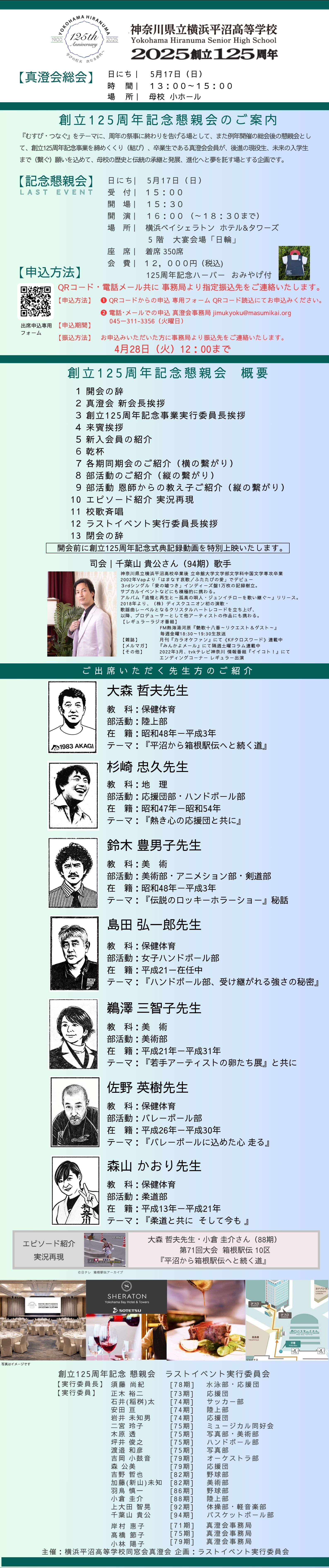 ラストイベントの企画内容等は、現在、真澄会内の実行委員会で検討しております。真澄会会員の皆様には、総会と併せて創立125周年記念懇親会「ラストイベント」へ奮ってのご参加をお願いいたします。