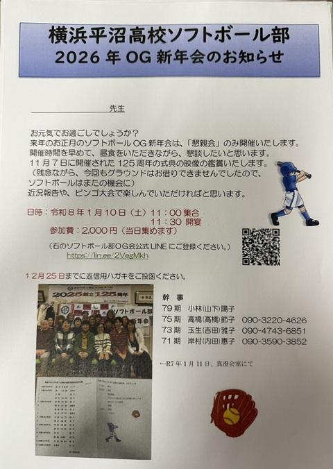 2025年1月10日(土)11:00より、真澄会室にてソフトボール部OGの新年会を行います。
