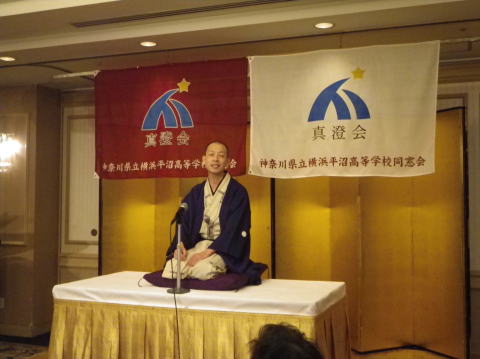 | 52期同期会報告 去る2016年10月27日、ホテルキャメロット・ジャパンにて、傘寿記念「52期最後の同期会」が行われた。 真澄会旗が飾られた会場には、79名が参加。記念撮影の後、いよいよ開宴。 「とれたて」のそば粉を使った「打ちたて」「ゆでたて」の手打ちそばコーナーが出現すると、あっという間に長蛇の列。懐旧談に花が咲き、旧交を温め宴もたけなはになったところで、突如出囃子とともに後輩・柳家小せん師匠(90期) が登場。真打の一席に爆笑が続いた。 こうして、傘寿を迎え最後となった52期同期会は、記念として真澄会グッズのキーホルダーを配布し、校歌斉唱、三本締めで幕を閉じた。なお、真澄会から10年ひと節祝金をいただきありがとうございました。 |