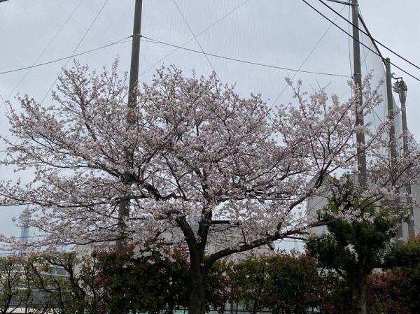 2020年4月2日、青空の下、母校の桜の風景です。花びらも舞って綺麗です。