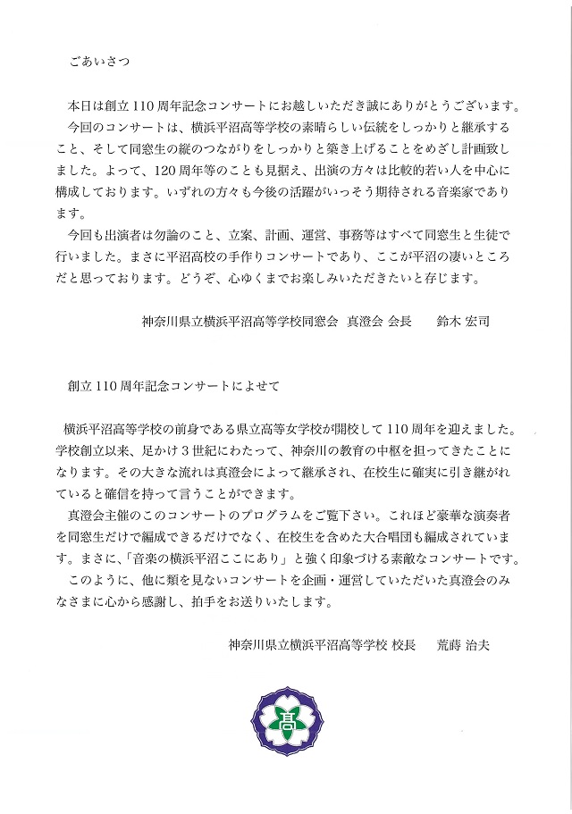 音楽系の平沼アーティストの紹介として、2010年10月24日(日)に開催された、110周年記念コンサートのパンフレットを掲載いたします。
