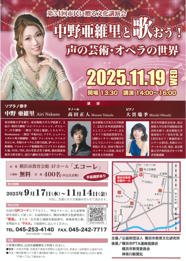 2025年11月19日(水)14:00から、横浜市教育会館4Fホールにてソプラノ歌手・中野亜維里さんのトーク&コンサート(講演会)が行われます。