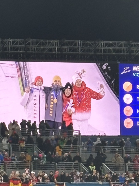写真:「スキーJUMP男子ノーマルヒルで、優勝したドイツの応援の人達と、二階堂選手の銅メダルをお祝いしました」